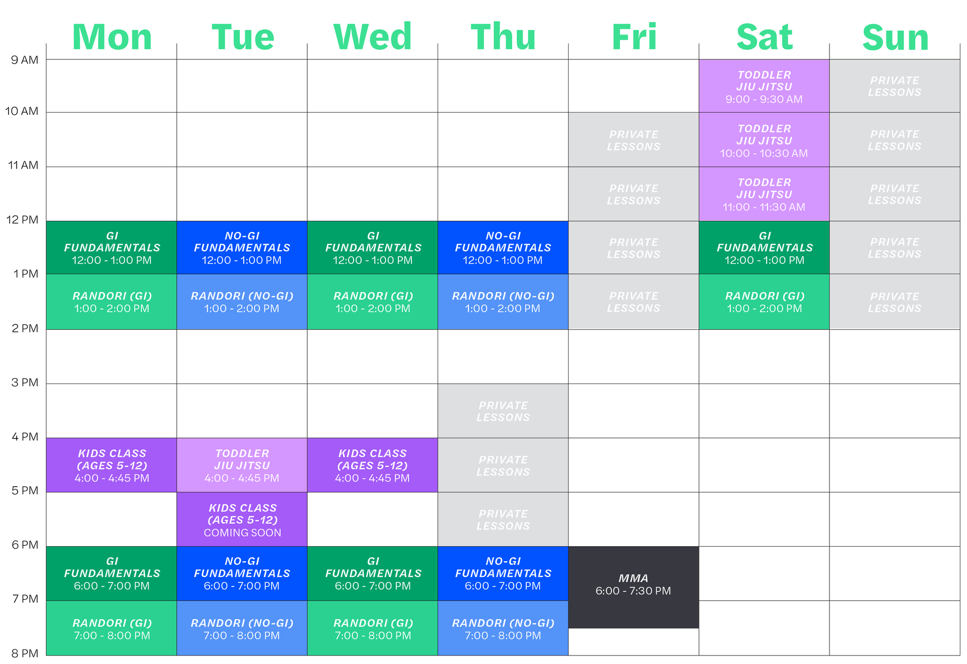 All students, regardless of rank, are expected to attend at least one session of No-gi Fundamentals each week.