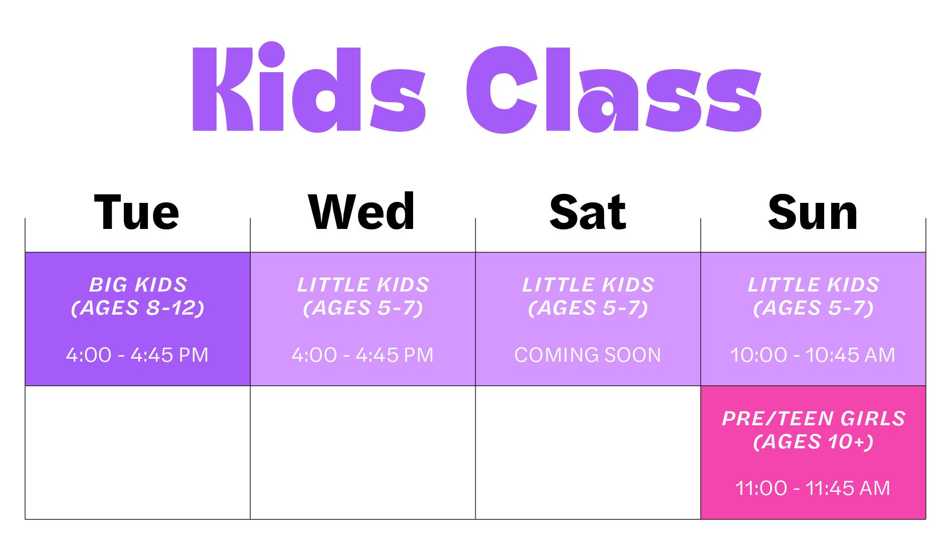 Little Kids (age 5-7) attend class on Wednesdays 4:00-4:45pm, Saturdays 11:00-11:45am, and Sundays 10:00-10:45am.